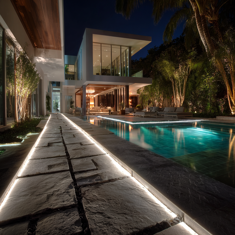 A collection of modern home renovation projects featuring sleek architecture, LED lighting, and illuminated poolside pathways at night.
